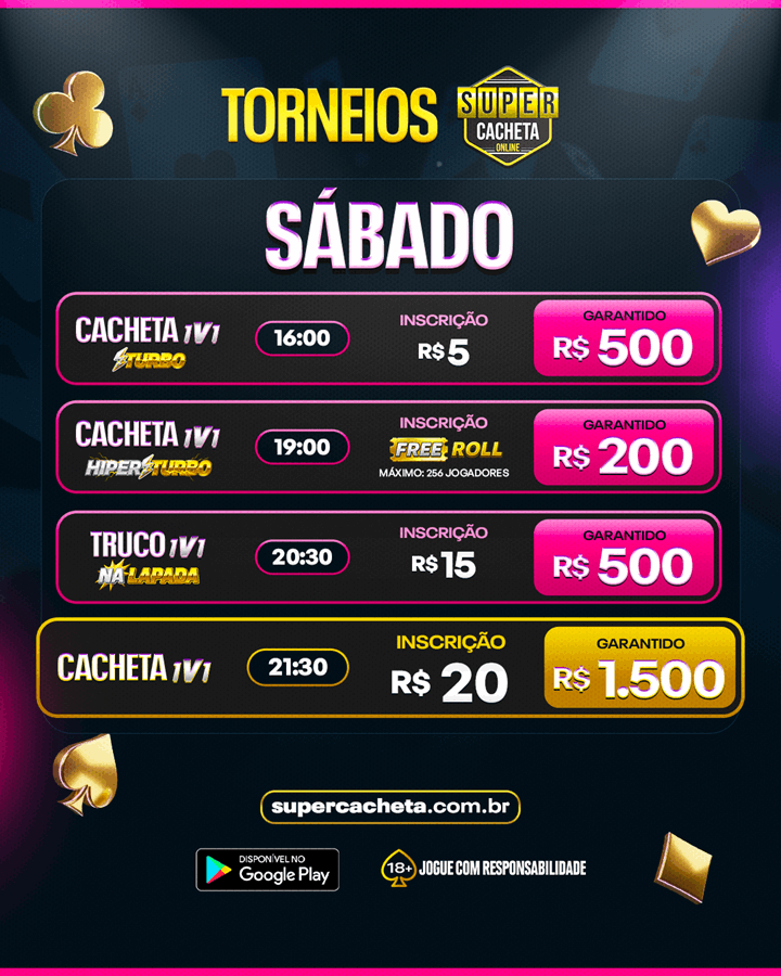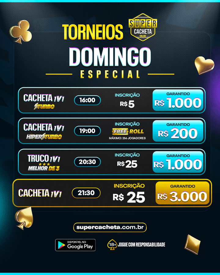 Além dos torneios pagos, o Super Cacheta Online oferece torneios gratuitos todos os dias. Jogue com jogadores de verdade hoje mesmo.